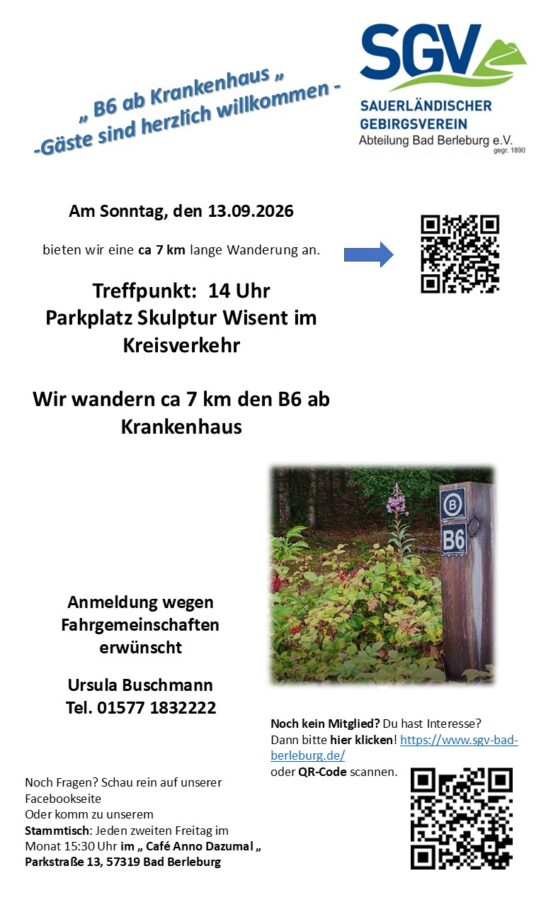 Am Sonntag, den 13.09.2026 Wanderweg B6 ab -Krankenhaus